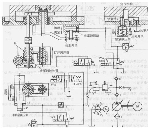 當壓力油進入夾緊液壓缸上腔,使活塞剛開始向下移動時,放開抬起時壓下的行程開關(guān),使電磁鐵4YA—5YA斷電,2YA通電,換向閥11處于中問位置,換向閥換向。壓力油經(jīng)換向閥10進入離合器14的液壓缸,將離合器打開,為回轉(zhuǎn)液壓缸齒條活塞返回做好準備。