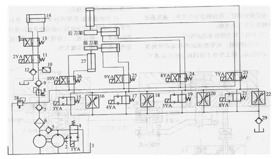 圖3示為雙泵供油系統(tǒng),低壓大流量泵2排油經(jīng)單向閥5與高壓小流量泵l排油匯合一處,經(jīng)過濾器6、單向閥7向系統(tǒng)各運動機構(gòu)提供壓力油,系統(tǒng)壓力由溢流閥28調(diào)定并保持。