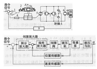 1-伺服放大器}2-電液伺服閥;3-雙桿液壓缸;4-位置傳感器;5-雙向變量液壓泵6-雙向定量液壓馬達;7-安全溢流閥組;8-補油單向閥組;9-測速電動機