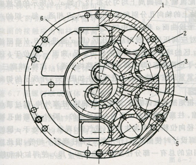 它由轉(zhuǎn)子缸體2、導(dǎo)軌3和柱塞5-鋼球1組成的球塞副、配流軸.4、外殼6等組成。圖1為具有10球塞六作用次數(shù)的馬達(dá)。所謂作用次數(shù)z,即每個(gè)球塞隨轉(zhuǎn)子轉(zhuǎn)一轉(zhuǎn)往復(fù)的次數(shù),也即導(dǎo)軌所具有的曲線凹凸數(shù)。配流軸4的作用是依次將高壓油分配給各球塞,并將低壓油從各球塞依次通過(guò)配流軸排出。柱塞5在高壓油推動(dòng)下,帶動(dòng)鋼球1沿徑向向外運(yùn)動(dòng),與曲線導(dǎo)軌3接觸,鋼球1與導(dǎo)軌曲線的相互作用如圖6-5所示。柱塞副所產(chǎn)生的液壓力P是沿柱塞軸線的。該力分為兩個(gè)力Ⅳ與F,Ⅳ力與導(dǎo)軌曲線相垂直,并與導(dǎo)軌曲線的反力相平衡。分力F即為推動(dòng)缸體旋轉(zhuǎn)的切向力。切向力F與向徑P(P為滾輪中心至馬達(dá)旋轉(zhuǎn)中心的距離)的乘積即為該球塞所產(chǎn)生的扭矩。各作功柱塞產(chǎn)生的扭矩之和即為液壓馬達(dá)在該瞬時(shí)的輸出扭矩。 為便于讀者進(jìn)一步了解,現(xiàn)以六作用八球塞的馬達(dá)導(dǎo)軌展。