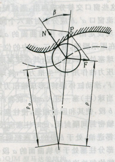 現(xiàn)設(shè)定內(nèi)曲面的a段對(duì)應(yīng)高壓區(qū),b段對(duì)應(yīng)低壓區(qū)(即a’通進(jìn)油B,b’通回油A),在圖示瞬間,曲面三、六中的位于a區(qū)的球塞處在高壓油的作用工況;曲面一、四位于b區(qū)段的球塞處于回油工況;其余球塞則處于過(guò)渡狀態(tài)(即與高、低壓回路均不通)。這樣,球塞三、六在壓力油作用下產(chǎn)生推力P,將球塞緊緊壓在導(dǎo)軌曲面上進(jìn)而產(chǎn)生如圖6-5中所示的切向分力F,推動(dòng)缸體旋轉(zhuǎn),形成輸出力矩。