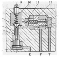 這種回路中卸荷閥的結(jié)構(gòu)是專門設(shè)計的(見圖9-llb),它與一般先導(dǎo)式壓力閥不同。其導(dǎo)閥8除了受彈簧10的力和b腔處液壓力作用外,還要承受柱塞7的推力。當(dāng)蓄能器開始充油時,卸荷閥中的導(dǎo)閥8和主閥12都處于關(guān)閉位置,油腔a和b處的壓力都等于泵壓,柱塞兩端液壓力平衡,對導(dǎo)閥不產(chǎn)生推力。隨著進(jìn)入蓄能器油液的不斷增多,油腔a和b中的壓力亦不斷升高;當(dāng)壓力升高到b腔的液壓力能克服導(dǎo)閥彈簧力,將導(dǎo)閥打開時,P口處來的壓力油便經(jīng)阻尼孔14、導(dǎo)閥閥口、主閥中心孔13和通口T流回油箱。由于阻尼孔的作用,b腔壓力小于泵壓,這使主閥閥口打開,泵開始卸荷。此時b腔壓力小于a腔壓力。柱塞便對導(dǎo)閥施加一額外的推力,促使導(dǎo)閥和主閥的閥口都開得更大,結(jié)果使b腔壓力下降到零,柱塞處于其最上端位置。由于a腔的工作面積比b腔大,因此蓄能器中的壓力即使因泄漏而有所下降,卸荷閥仍能使泵處于卸荷狀態(tài)。蓄能器所能達(dá)到的最高壓力由調(diào)節(jié)螺釘9調(diào)定。