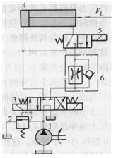1-液壓泵2-溢流閥3-三位四通電磁換向閥4-液壓缸5-=位三通電磁換向閥 6-單向調(diào)速閥