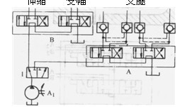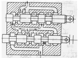 復聯(lián)系統(tǒng)是以上三種系統(tǒng)的組合,如并聯(lián)一獨聯(lián)、串聯(lián)一獨聯(lián)、串聯(lián)一并聯(lián)等系統(tǒng)。圖1. 3-6為并聯(lián)一獨聯(lián)系統(tǒng)。多路閥A控制一部分并聯(lián)的液壓執(zhí)行機構。多路閥B則控制另一部分并聯(lián)的液壓執(zhí)行機構。但兩個多路閥所控制的執(zhí)行機構之間是相互獨立的。所以在B閥操縱的執(zhí)行機構動作時,即使誤操作A閥,也不會使A閥控制的執(zhí)行機構誤動作。
