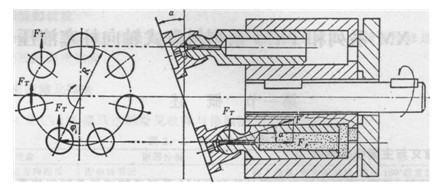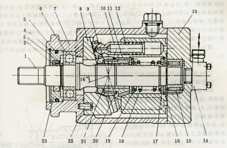 該馬達的另一端,用高強度耐磨鑄鐵制造的配流端蓋13與殼體7相連接。配流端蓋13主要有下述幾個作用:第一,中間的軸承孔內裝置著傳動軸1里端的支承軸承14,使傳動軸1在馬達內,以簡支梁形式較好地擔負承重、旋轉的工作。第二,與液壓馬達殼體7連接并圍護成一個完整性的機械,并可防止液壓油外泄。第三,在外端設有與進油、回油連接通道接頭14,該通道在端蓋內端制成與XM配流盤一樣形狀的進油和出油配流窗口,并直接與由鐵基滲銅粉末冶金制成的缸體內端面配合成一密封的滑動副,以保證液壓馬達的正常運轉和容積效率的達到。