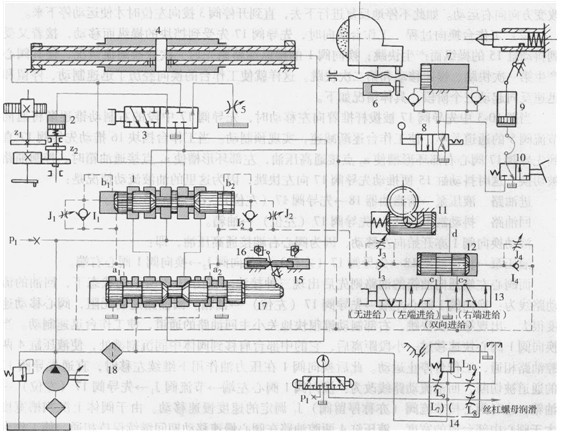 1一換向閥2-百鎖缸3-開停閥4-工作臺液址缸5-節(jié)流聞6閘缸7快動缸8-快動閥9尾架缸IO-尾架閥11-進給缸12-進給閣13-選擇閥14潤滑穩(wěn)定器15-抖動缸 16捎塊17先導閥I8精過濾器