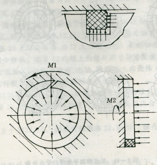 馬達(dá)運(yùn)轉(zhuǎn)時(shí),應(yīng)使密封環(huán)壓在孔壁上不動(dòng),運(yùn)轉(zhuǎn)時(shí),旋轉(zhuǎn)運(yùn)動(dòng)副當(dāng)發(fā)生在配流軸的環(huán)槽側(cè)壁與相對(duì)密封環(huán)的側(cè)面上。若密封環(huán)隨配流軸轉(zhuǎn)動(dòng),則配流缸壁很快會(huì)磨出凹槽而破壞密封作用,因此,在設(shè)計(jì)時(shí)要根據(jù)M1>M2的要求確定密封環(huán)的內(nèi)半徑r1,并校核環(huán)內(nèi)側(cè)壁與密封環(huán)的接觸比壓。 密封環(huán)兩側(cè)面平行度之差為0.O1mm,端面與內(nèi)、外圓柱面垂直度允差為0.O1mm。
